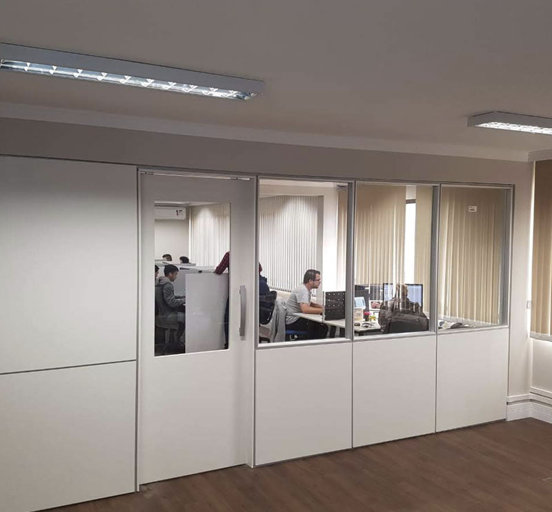 Executamos a instalação de divisórias operáveis com painéis e vidros, garantindo agilidade em ambientes corporativos, industriais, educacionais e comerciais.